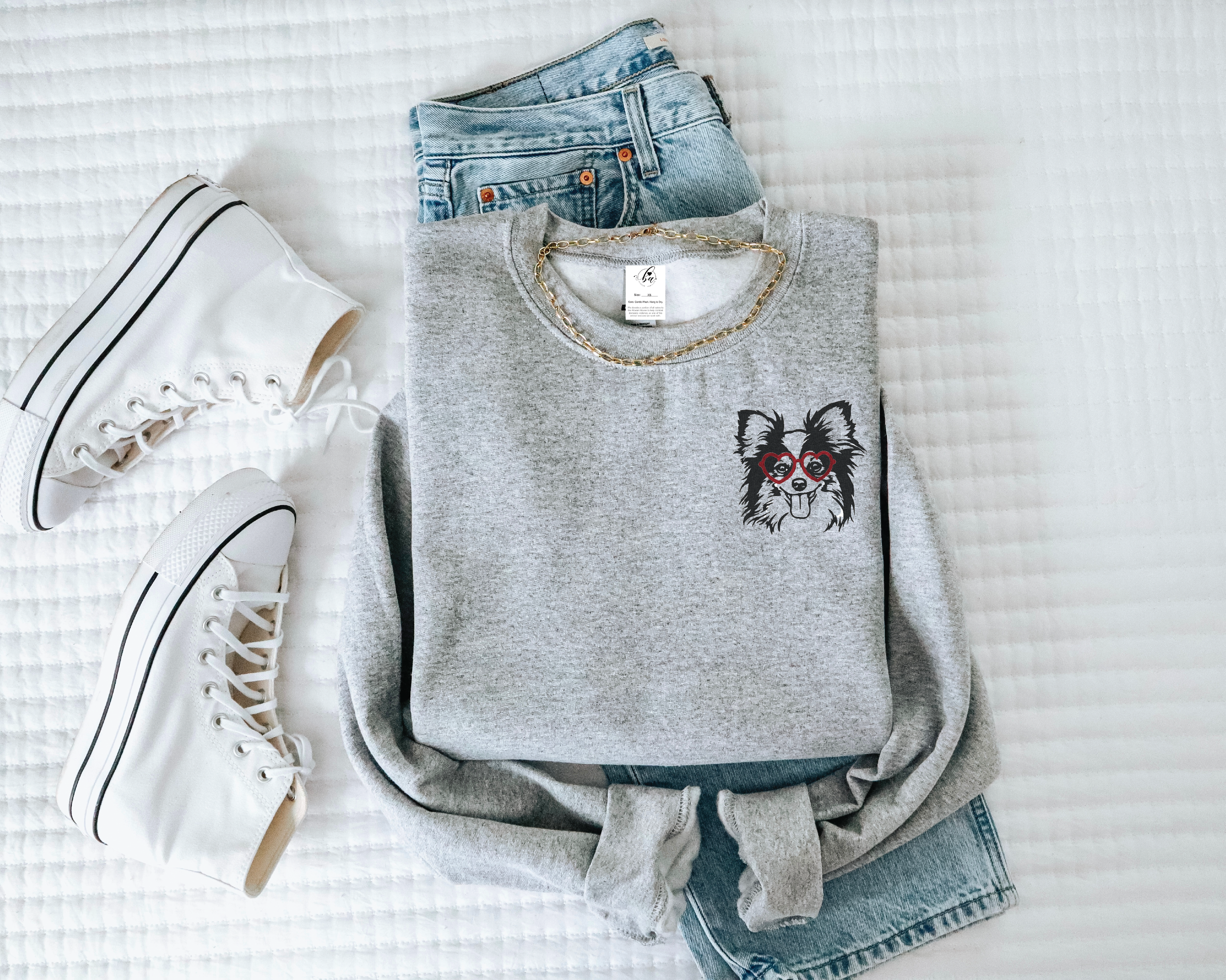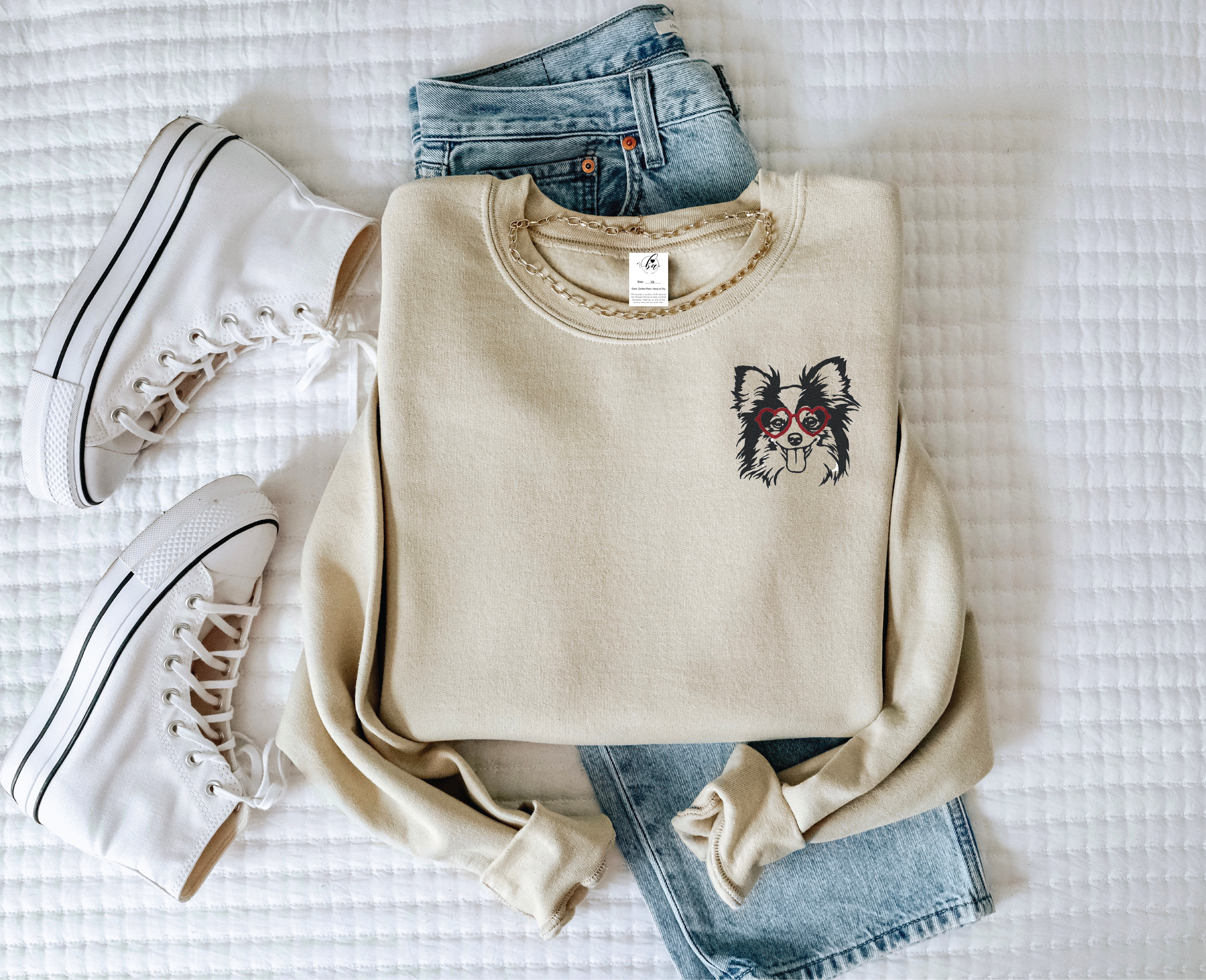 Papillon with Heart Glasses Embroidered CLASSIC Crew Neck Sweater