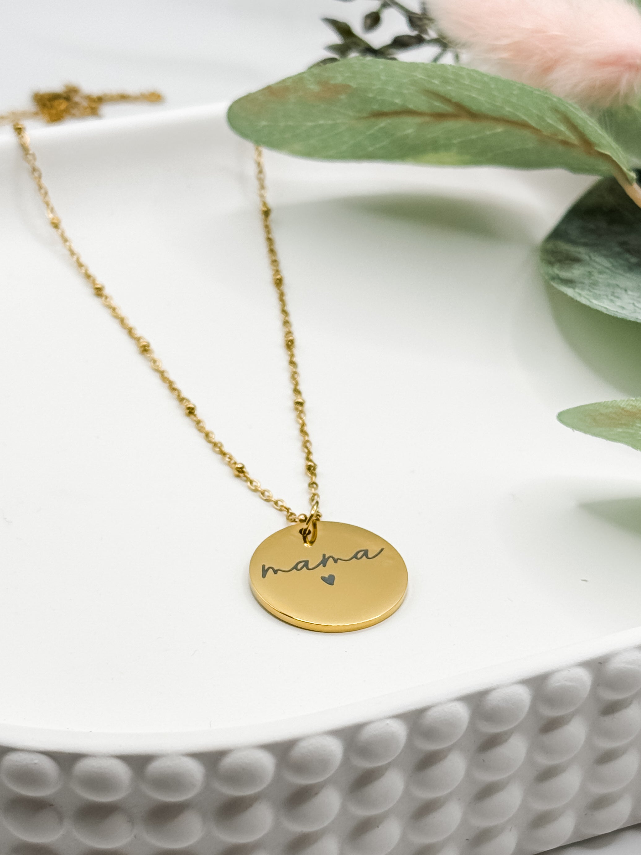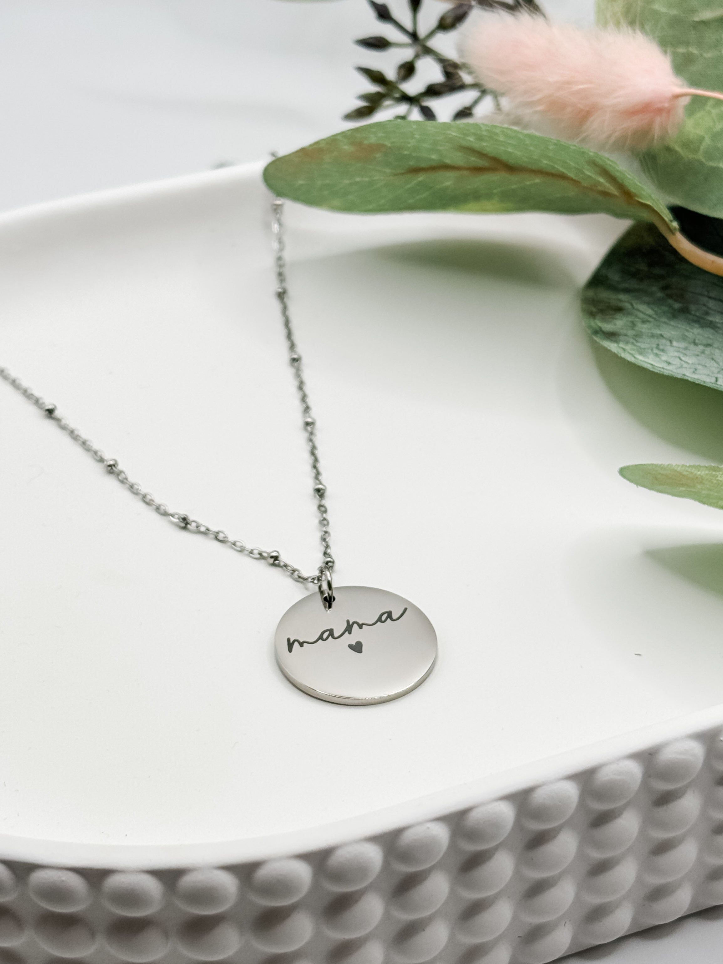 This exclusive necklace is designed, engraved and assembled in house by us! It features our mama script design with a heart on a circle pendant with a gorgeous chain that is adjustable from 18" - 20". The chain is 3mm in width for a stunning delicate look and this necklace looks great on its own or layered with additional pieces.