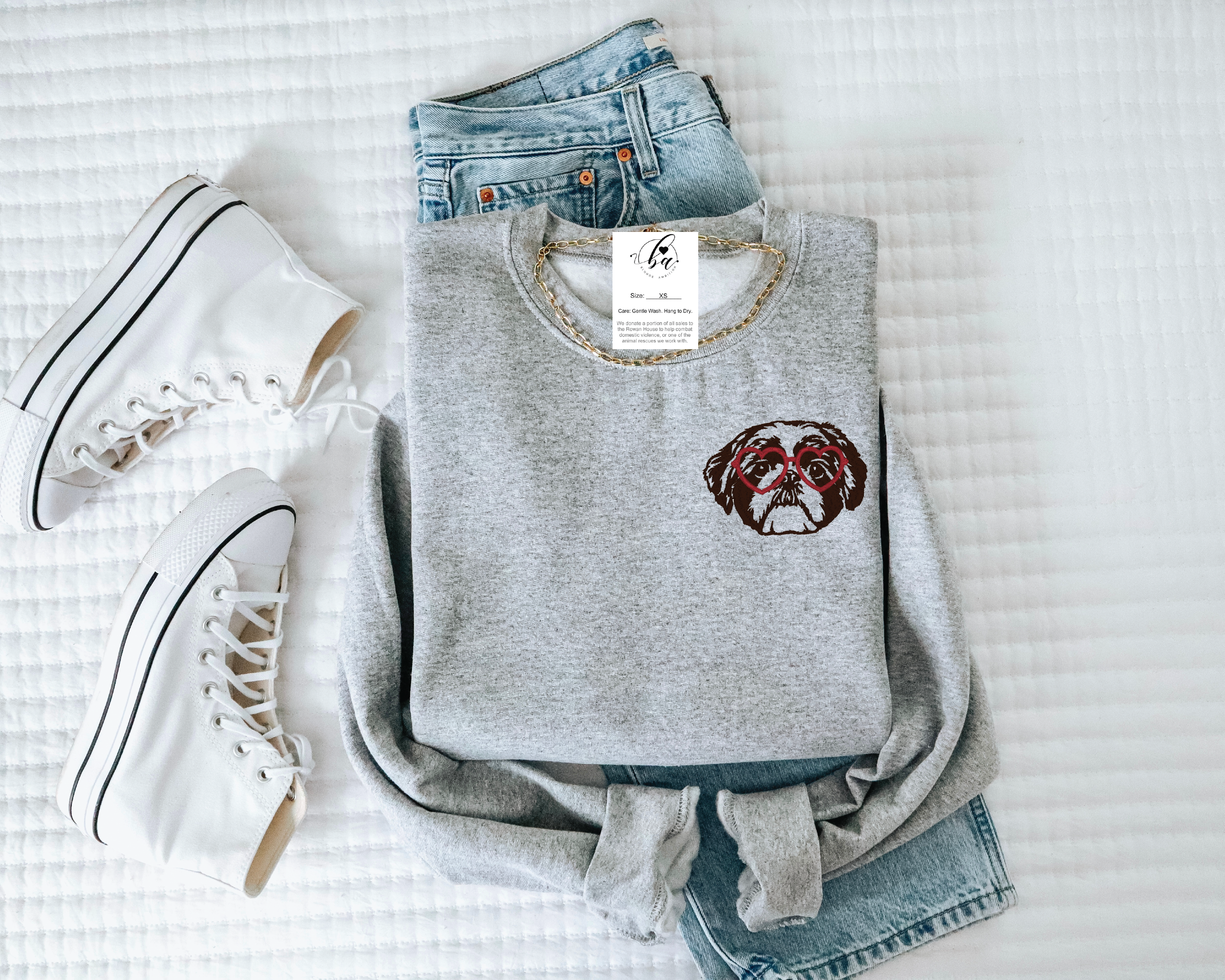 Shih Tzu with Heart Glasses Embroidered CLASSIC Crew Neck Sweater