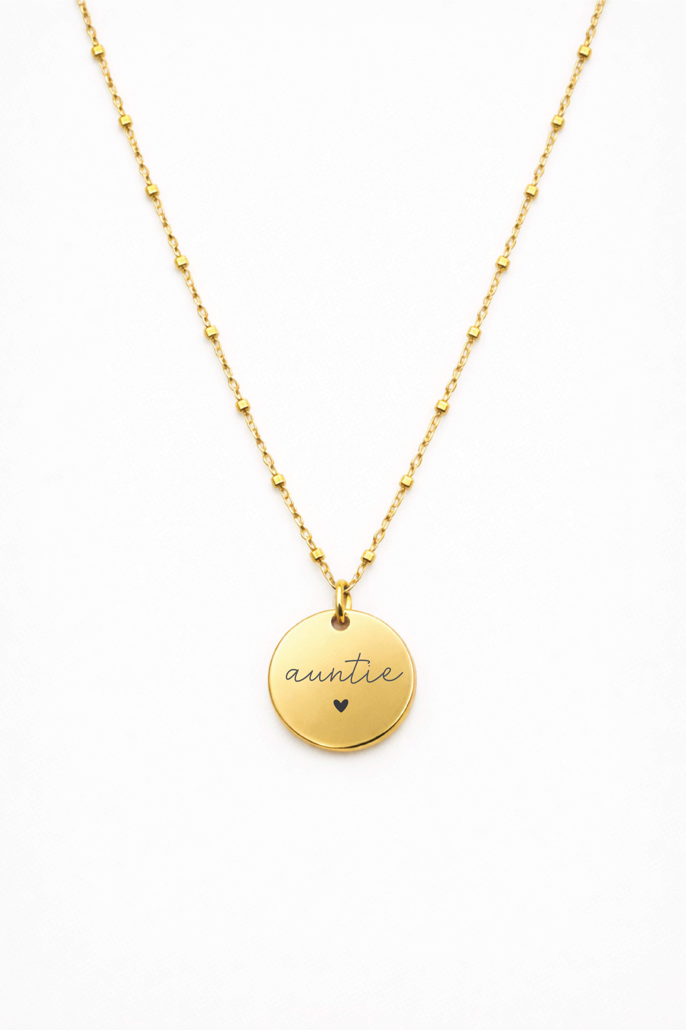 This exclusive necklace is designed, engraved and assembled in house by us! It features our auntie script design with a heart on a circle pendant with a gorgeous chain that is adjustable from 18" - 20". The chain is 3mm in width for a stunning delicate look and this necklace looks great on its own or layered with additional pieces.