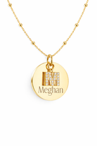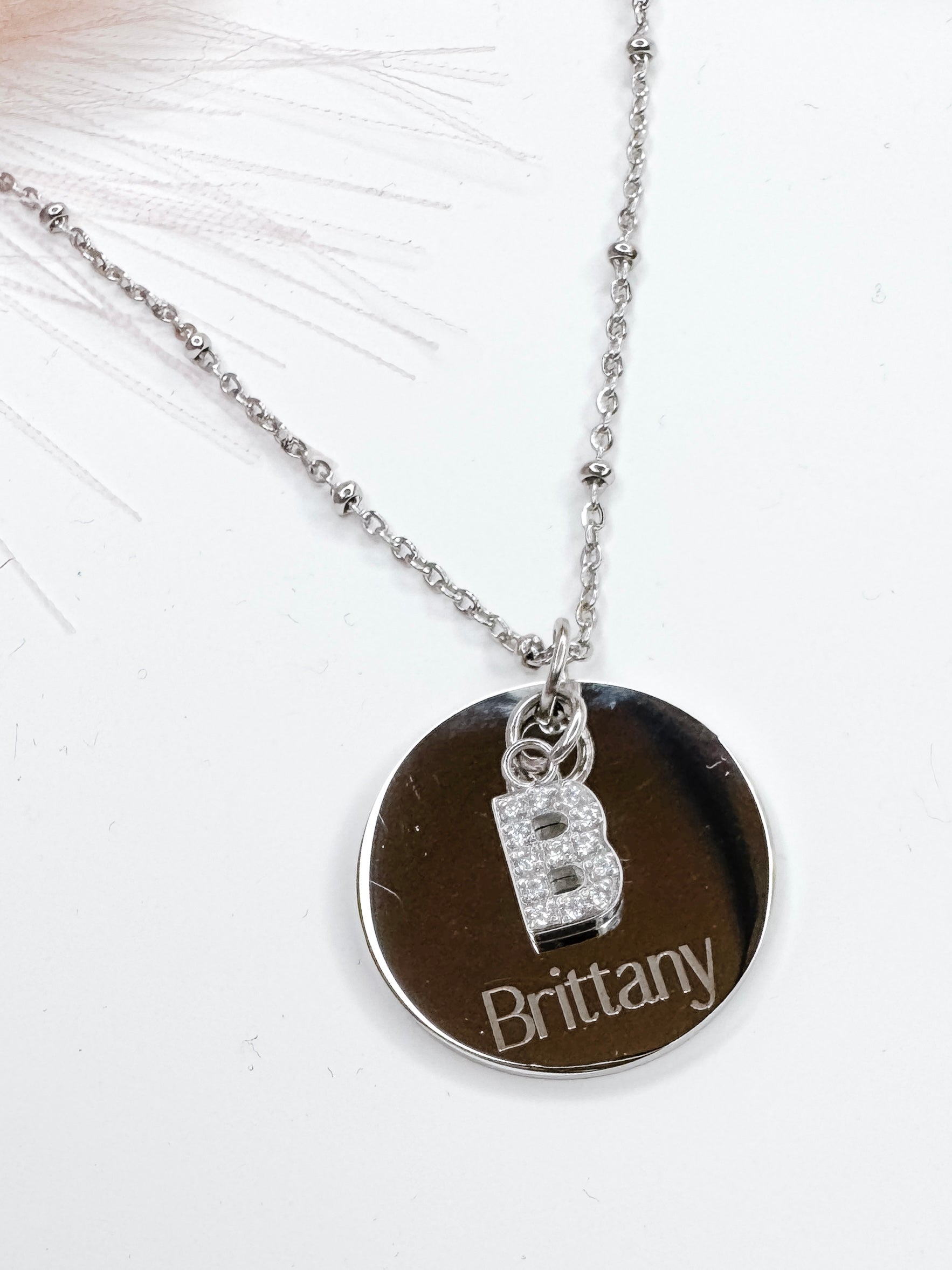 These exclusive necklaces are designed, engraved and assembled in house by us! It features a personalized name, with a cubic zirconia initial charm.