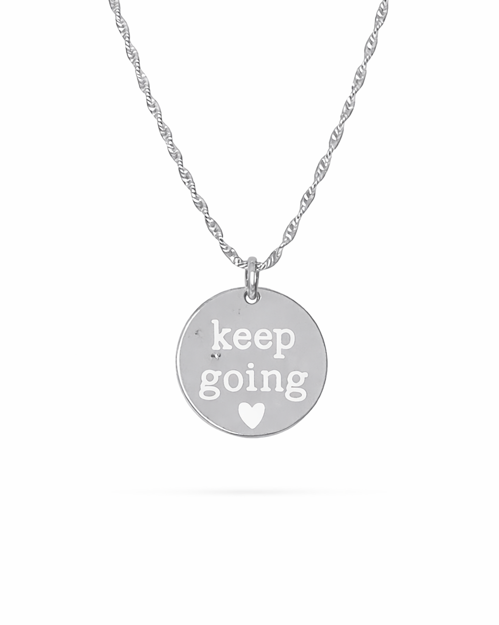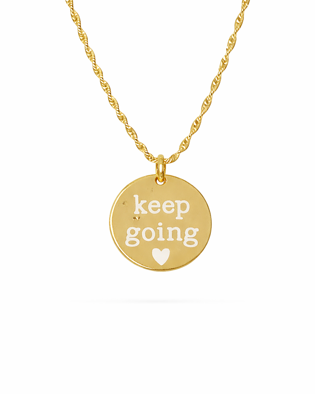 This exclusive necklace is designed, engraved and assembled in house by us! It features our 'keep going' design on a circle pendant with a gorgeous chain that is adjustable from 18" - 20". The chain is 3mm in width for a stunning delicate look and this necklace looks great on its own or layered with additional pieces.