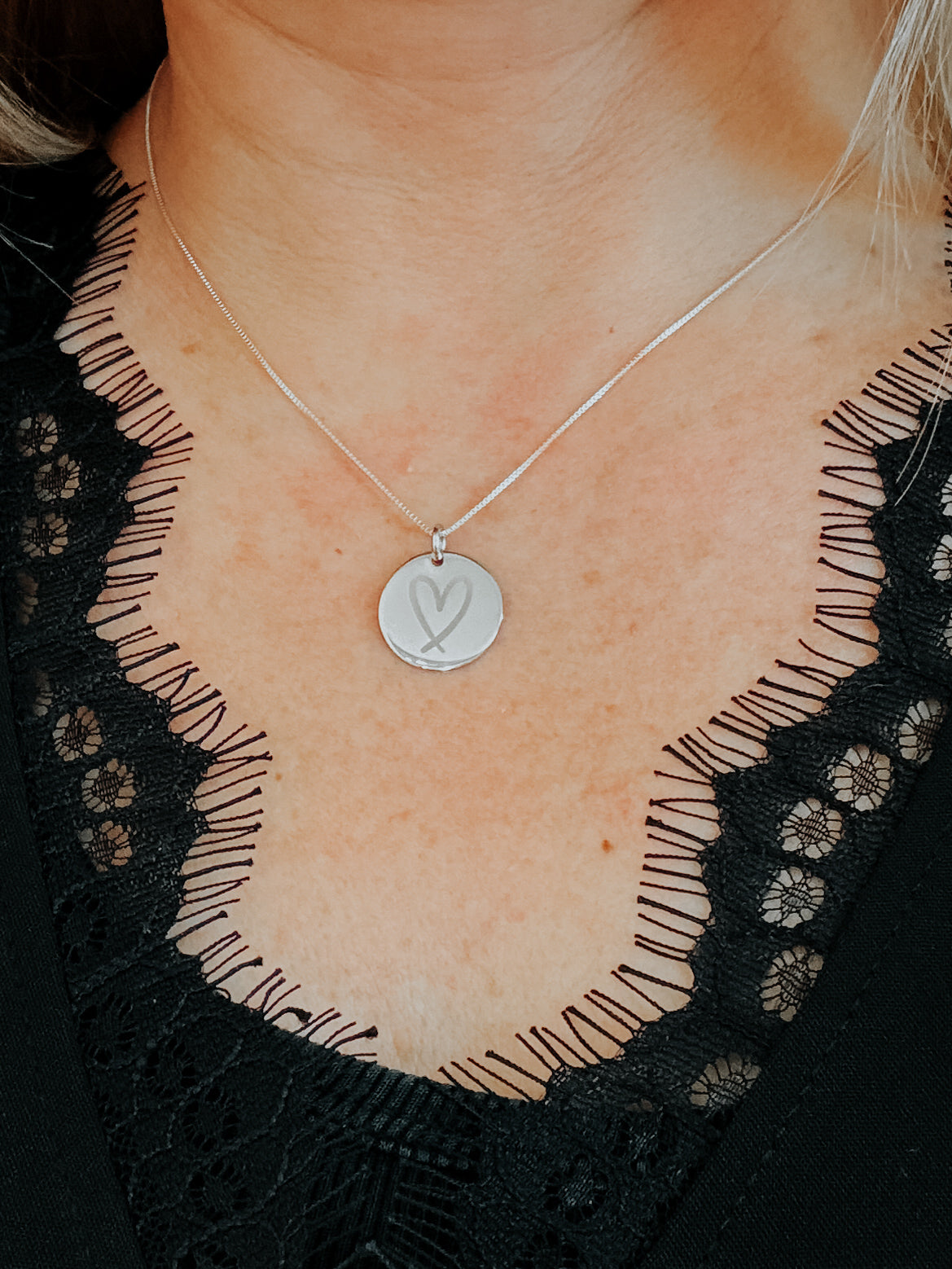 **Sterling Silver ** Disc Pendant Necklace - Engraved Heart
