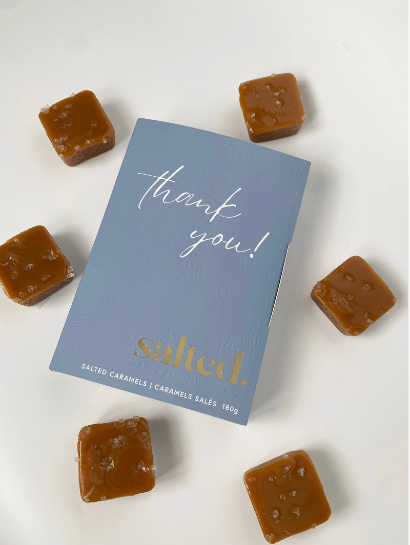 Indulge in life's little moments with our 6-piece box of classic salted caramels. Boxed in an elegant, embossed Thank You card box with a soft blue finish and gold detailing, this thoughtful treat combines timeless style with irresistible flavour. Each caramel is crafted to perfection, offering a balance of rich, buttery sweetness and a hint of sea salt. This beautifully designed box is sure to make anyone feel appreciated.
