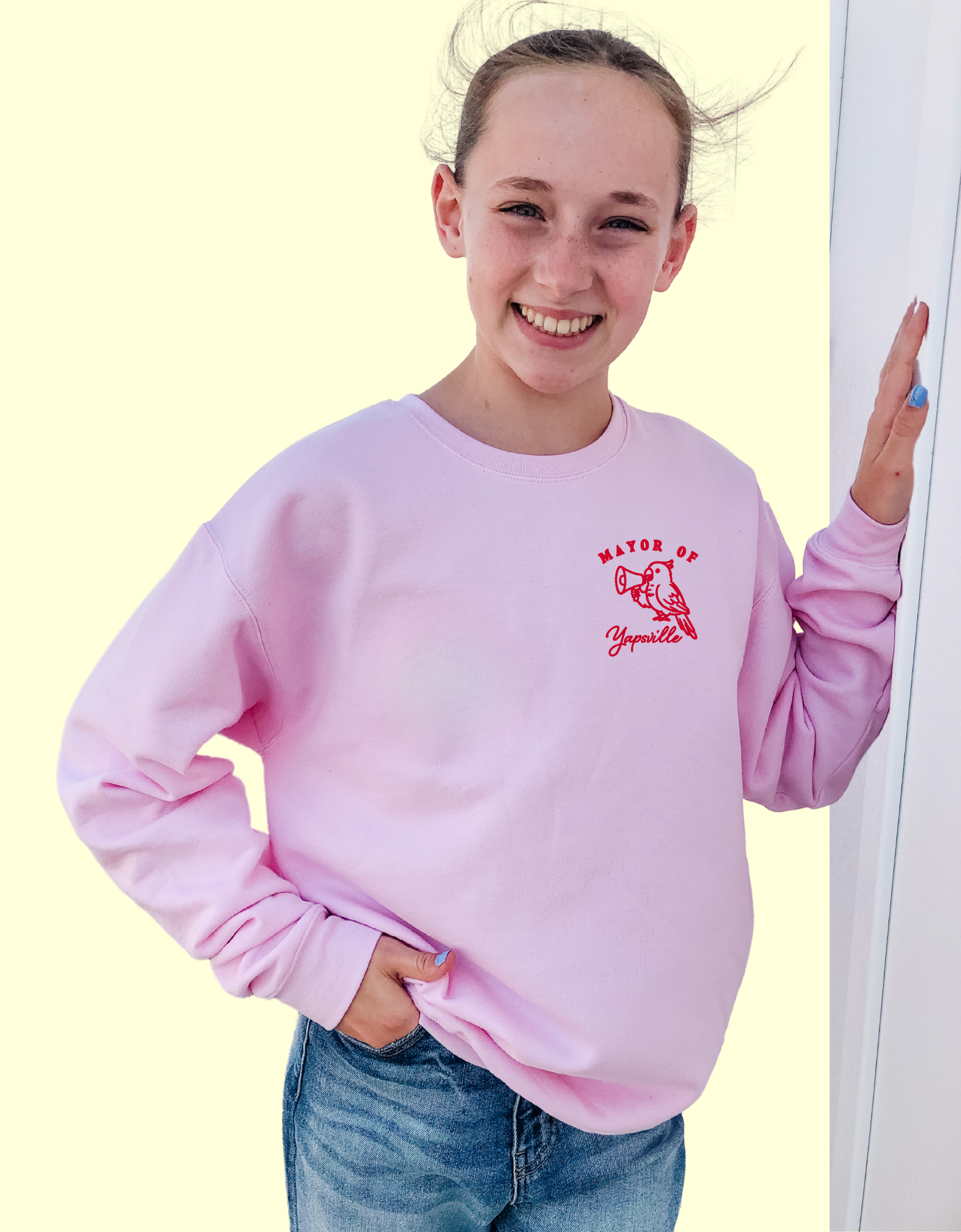 SALE:Medium Cozy Crew Sweater - Light Pink - Embroidered Mayor of Yapsville